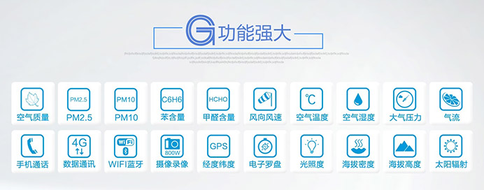 可測量要素為:風速,風向,氣流,環境溫度,環境濕度,氣壓,太陽輻射,紫外線強度,風寒指數,熱指數,露點,海拔高度,海拔密度,位置經度緯度,電子羅盤,時間,GPS,CO2濃度,土壤水份/溫度、雨量、熱流等(用戶可根據使用要求選配以上測量要素)。