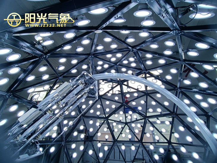 擴散光源是模擬天空的背景光,老式的人工天穹采用固定的燈光系統照明白色半球面來模擬,由于靠內壁擴散,需將內表面進行擴散處理,往往受制于現場人為的施工質量,效果很難達到;另外,由于光源只能固定在底部,各點亮度都是靠各組光的疊加產生的亮度分布,每組燈的調控都會影響全局,很難調試。本系統采用節能高效的LED矩陣,特制擴散燈罩、進口定制高透過率擴散膜。將光源布置在透光擴散膜后面,提高了光效,而且由于每組燈的調控,只影響該組位置的亮度,所以調試起來很方便,也更精準。