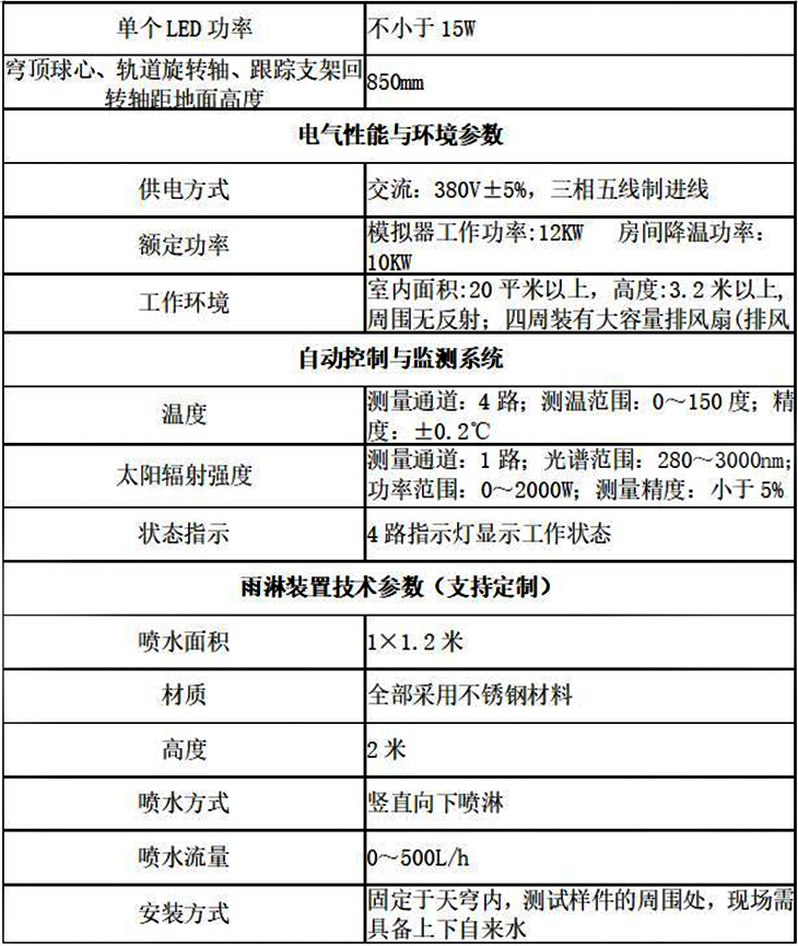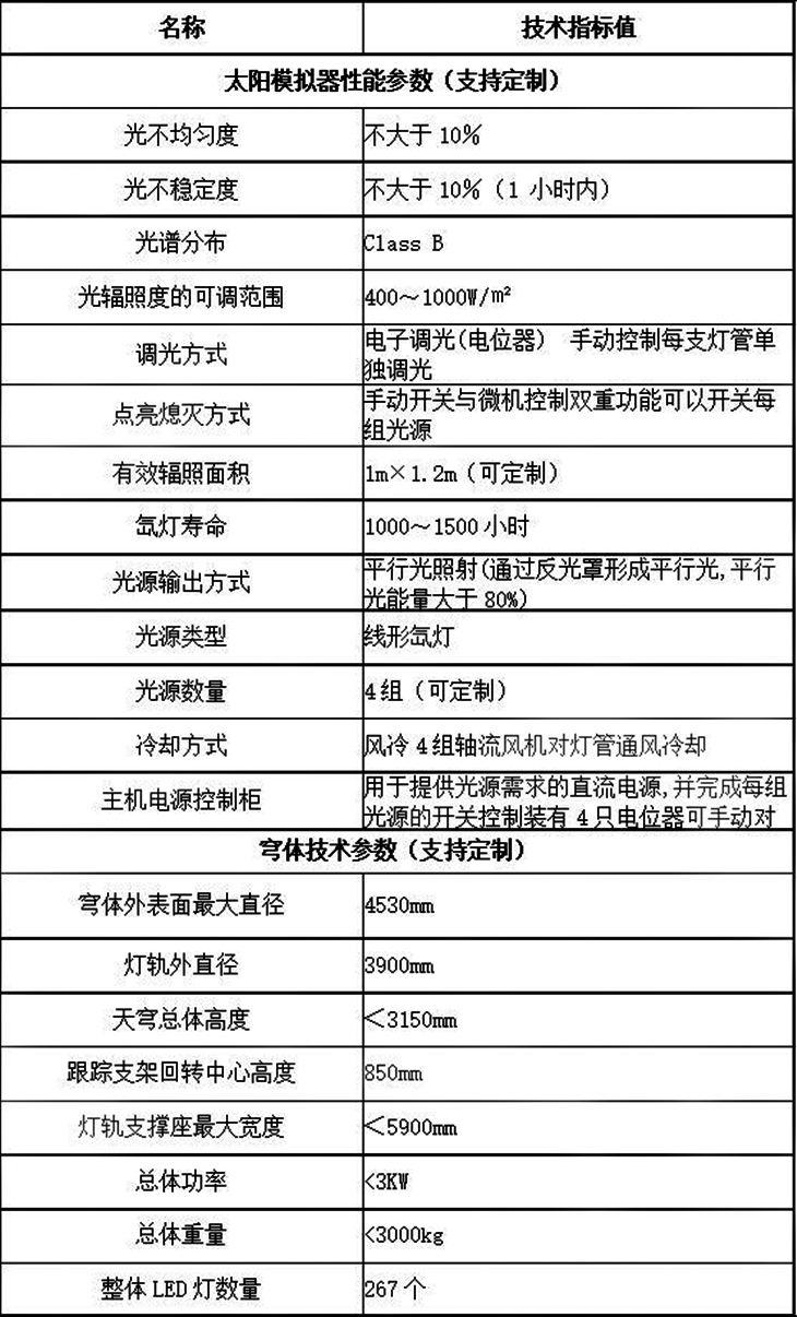 2、模擬太陽輻照強度可調,光譜分布Class B,被輻照面輻照均勻度≥90%,光源穩定性≥90%,被輻照面輻照值400~1000W/m²可調,光源端面到被      輻照面距離約0.5~1.4米;