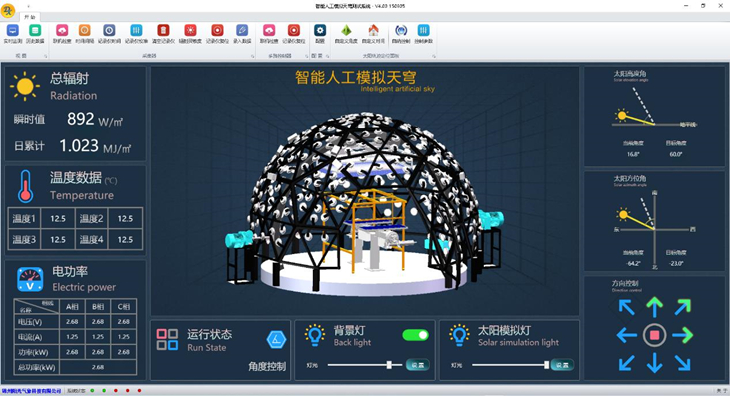 系統配置電腦端的控制軟件,軟件界面美觀,功能強大,可實現背景燈、模擬燈的明暗控制;模擬燈可以導入時間及功率比例進行自動控制;設定高度角 、方位角,自動運行到指定位置、設置好經緯度,根據本機時間模擬太陽自動運行到指定位置;東西上下手動控制等功能。