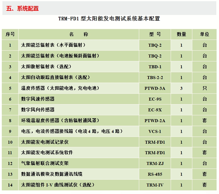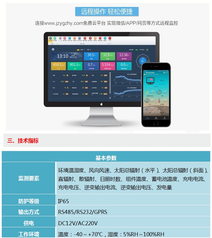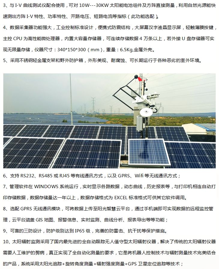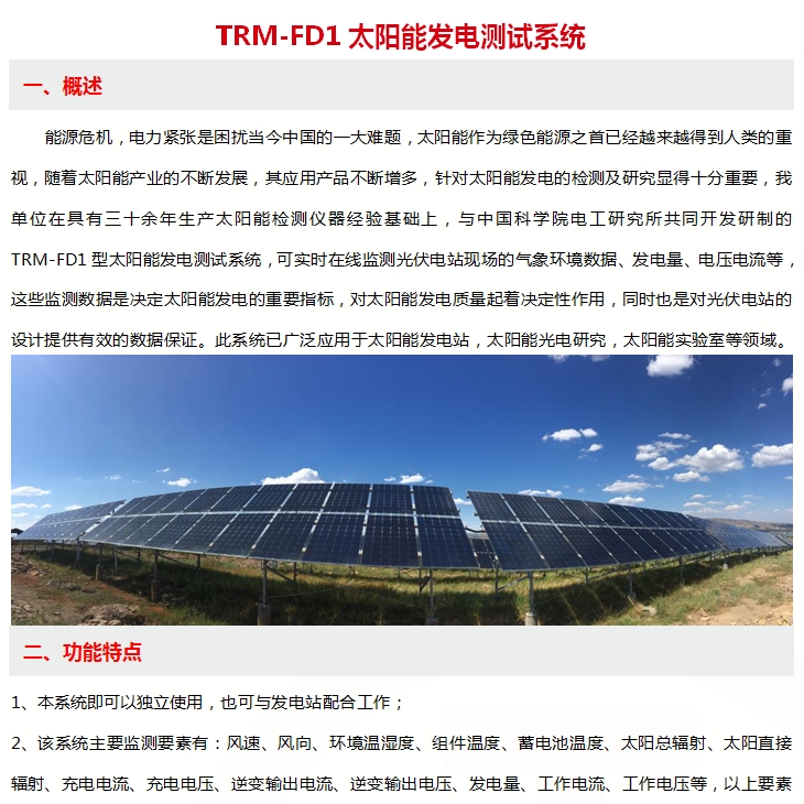 TRM-FD1型太陽能發電測試系統,可實時在線監測光伏電站現場的氣象環境數據、發電量、電壓電流等,這些監測數據是決定太陽能發電的重要指標,對太陽能發電質量起著決定性作用,同時也是對光伏電站的設計提供有效的數據保證。