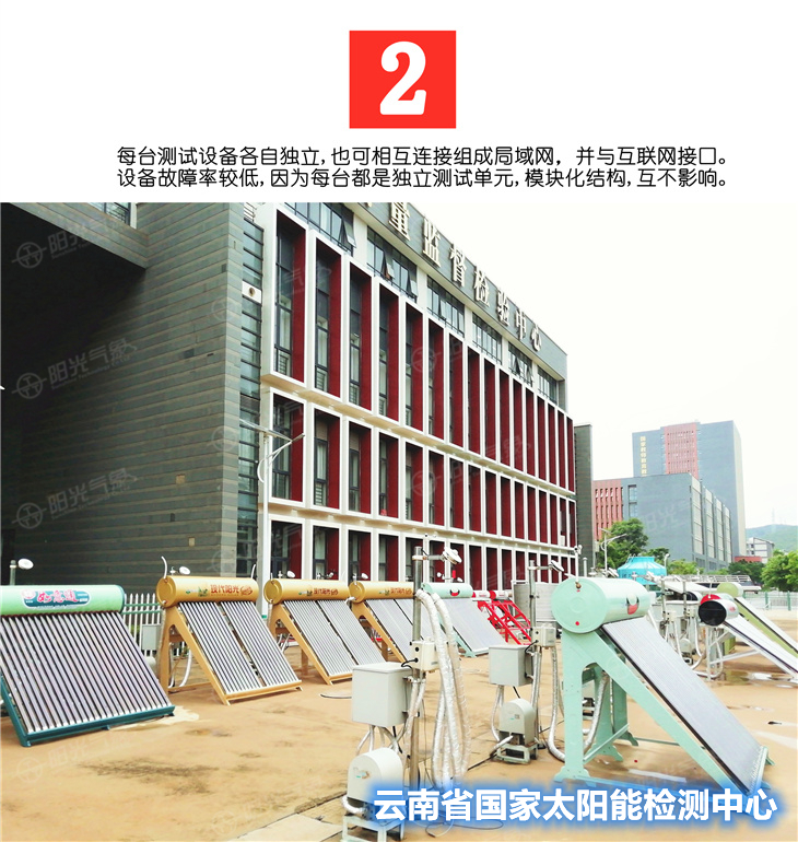多年來錦州陽光氣象科技公司建設了眾多太陽能檢測中心,均都通過了CNAS認證,得到了認可. 我們根據多年研究太陽能熱水器檢測設備的經驗,結合了檢測技術,現推出先進的網絡化太陽能測試系統, 可滿足廣大太陽能熱水器生產廠,質檢所,檢測中心,科研教學等領域的使用。