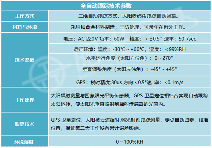 3、自主研發的太陽輻射儀是目前國內最先進的無人值守型太陽輻射儀器,解決了傳統的光伏電站太陽輻射儀器需要人工維護的弊病,真正實現了全自動化測量的要求,它是將機器人控制技術與輻射測量技術完美結合的產品,系統采用太陽光追蹤+旋轉角度測量+輻射強度測量+GPS衛星定位追蹤等綜合技術,可保證高精度的跟蹤太陽。
