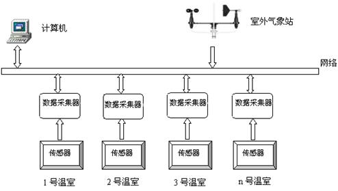 日光溫室集群監控系統包括:計算機、打印機、數據采集器、溫室用傳感器(溫度、濕度、光照等)、監控軟件。