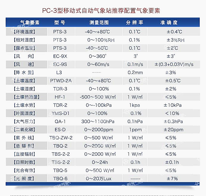 自動氣象站是一種能自動地觀測和存儲氣象觀測數據的設備,PC-3型移動式自動氣象站采用一體化設計,它具有移動觀測能力,測量精度高,集成多項氣象要素的可移動觀測系統,可測量風向、風速、溫度、濕度、氣壓、雨量、光照度、土壤溫度、土壤濕度、露點、太陽輻射量、太陽紫外線等多項信息并做公告和趨勢分析便于用戶對氣象數據的使用、分析和處理。該氣象站是測量氣象要素非常全面的小氣候觀測站,可根據用戶需要靈活增加或減少相應的模塊和傳感器,可滿足各類用戶的需求。