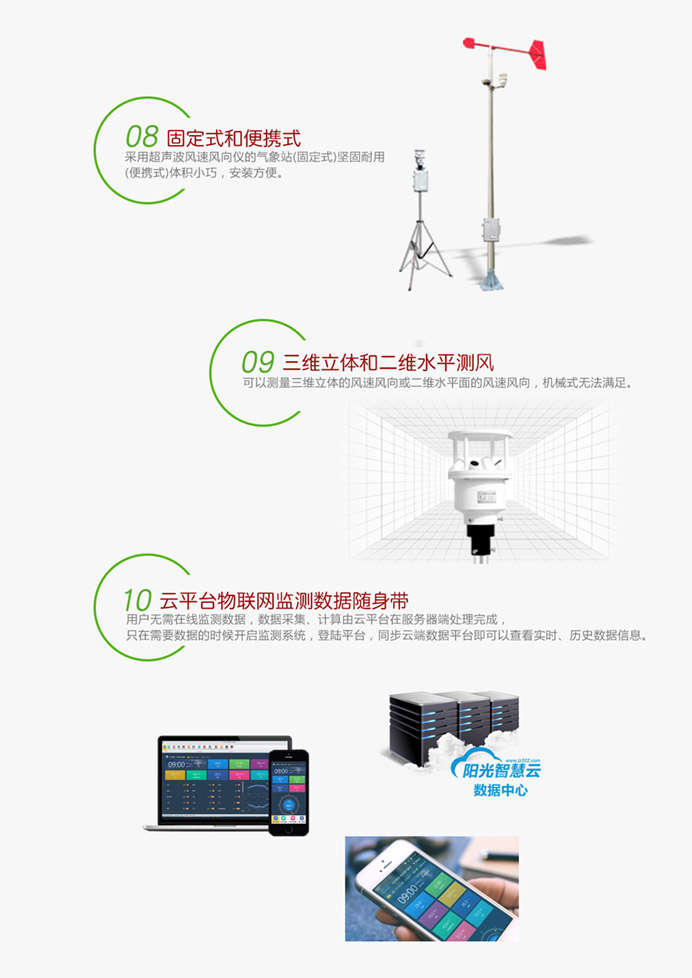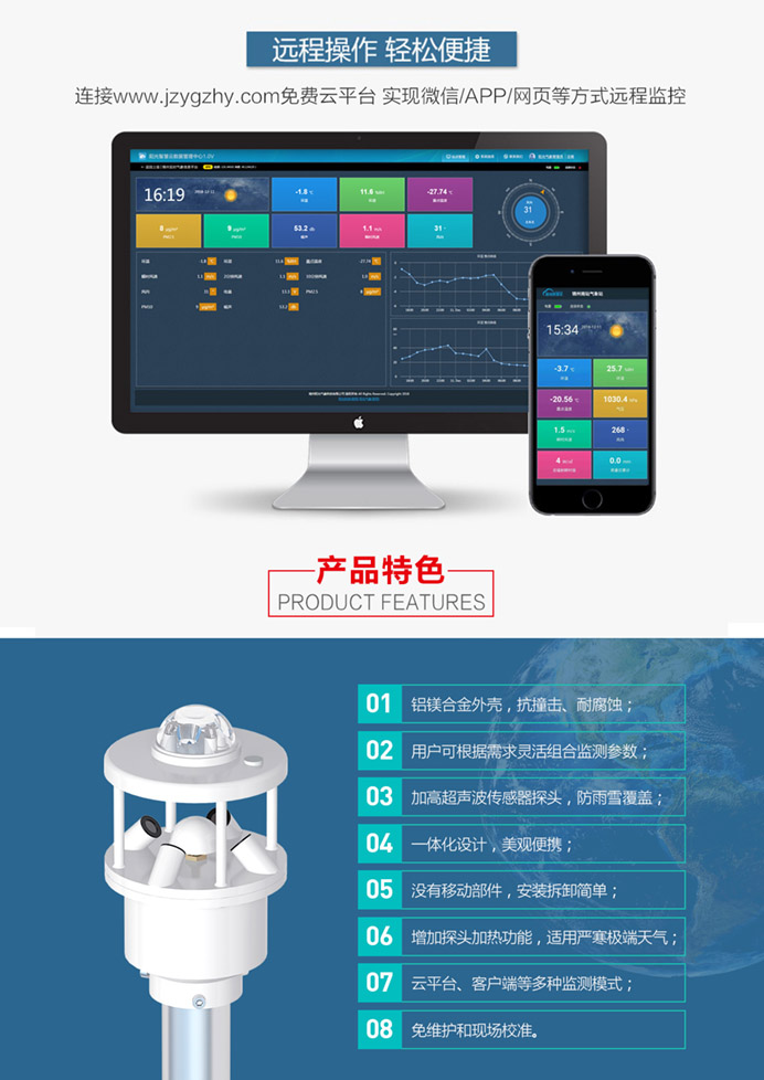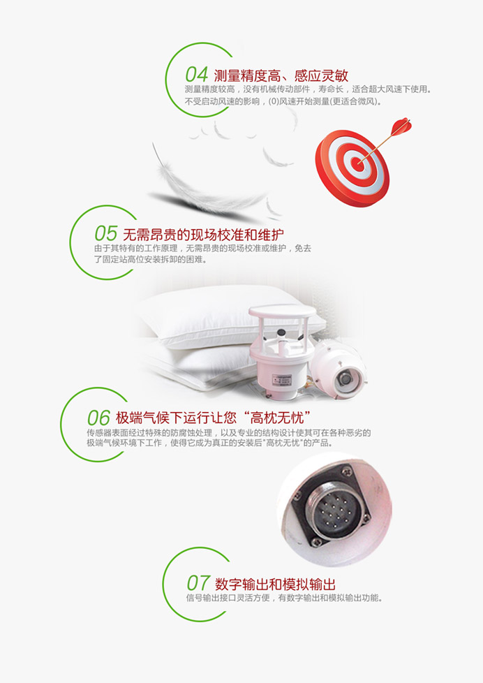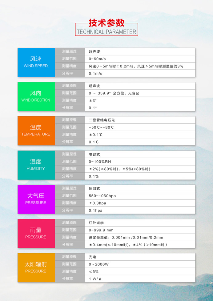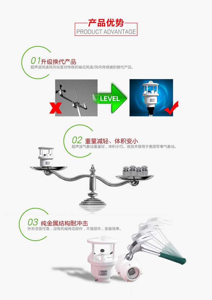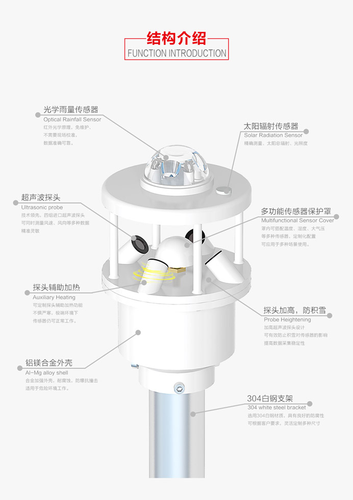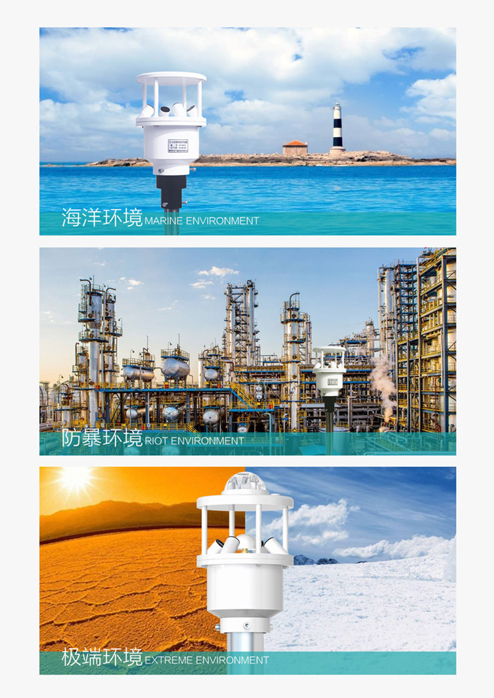 該氣象站采用超聲波探頭來測量風速和風向,沒有任何移動部件,儀器結構緊湊,更加耐用,數據更加可靠。也可用內置的溫度、濕度和氣壓傳感器等傳感器探頭監測相關氣候指標。精確的測量數據可以幫助氣象、水利、交通及科研等組織提供精確的數據依據及判斷條件。