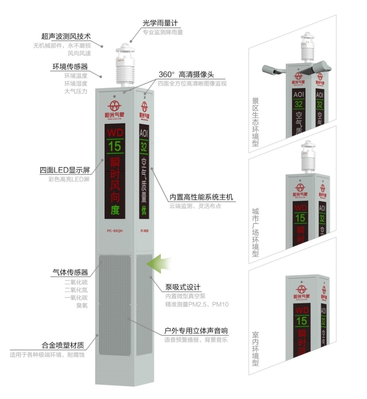 PC-9XQH 景區(qū)氣象站以“物聯網+智慧感知”為核心,建立覆蓋全區(qū)域的環(huán)境空氣質量自動監(jiān)測網絡,并實時顯示播報。景區(qū)氣象站由金屬外殼立柱、氣象環(huán)境傳感器、系統采集主機、LED顯示、智能語音播報、物聯網云平臺數據存儲、終端顯示組成。