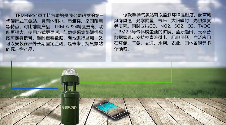 TRM-GPS4型手持氣象站是我公司研發(fā)的第三代手持式氣象儀器,具有體積小、重量輕、堅(jiān)固耐用等特點(diǎn)。對比常規(guī)手持產(chǎn)品,TRM-GPS4精度更高、功能更強(qiáng)大、使用方式更靈活。與數(shù)據(jù)采集終端搭配,即可隨身攜帶、隨時(shí)查看數(shù)據(jù)、隨地進(jìn)行監(jiān)測,又可以安裝在戶外長期固定監(jiān)測。是未來手持氣象站標(biāo)志性產(chǎn)品。