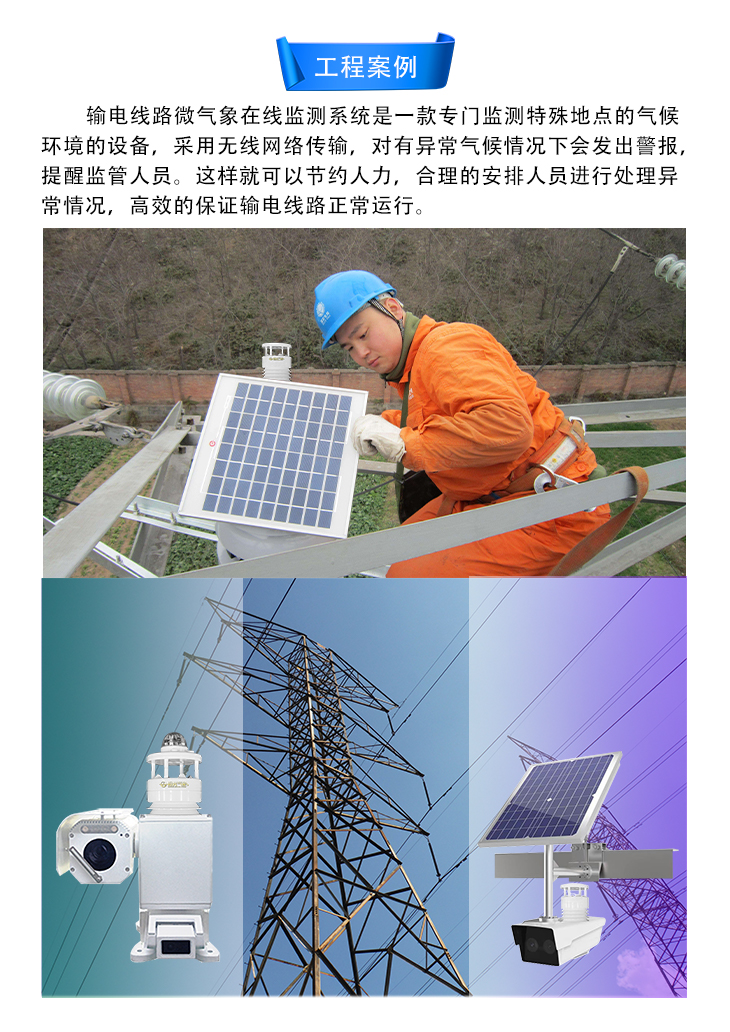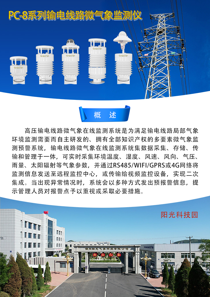 高壓輸電線路微氣象在線監(jiān)測系統(tǒng)是為滿足輸電線路局部氣象環(huán)境監(jiān)測需要而自主研發(fā)的、擁有全部知識產(chǎn)權(quán)的多要素微氣象監(jiān)測預警系統(tǒng),輸電線路微氣象在線監(jiān)測系統(tǒng)集數(shù)據(jù)采集、存儲、傳輸和管理于一體,可實時采集環(huán)境溫度、濕度、風速、風向、氣壓、雨量、太陽輻射等氣象參數(shù),并通過RS485/WiFi/GPRS或4G網(wǎng)絡將監(jiān)測信息發(fā)送至遠程監(jiān)控中心,或傳輸給視頻監(jiān)控設備,實現(xiàn)二次集成。當出現(xiàn)異常情況時,系統(tǒng)會以多種方式發(fā)出預報警信息,提示管理人員對報警點予以重視或采取必要措施。