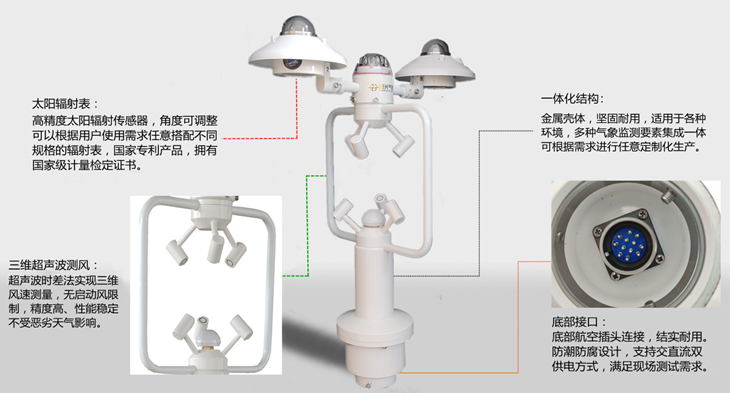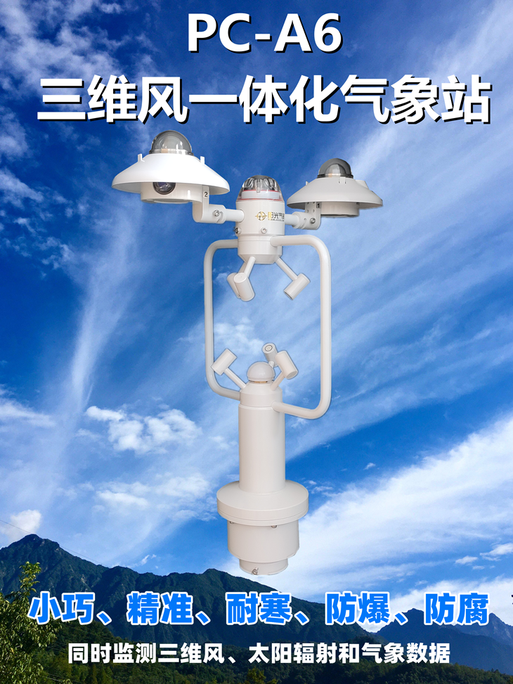 PC-A6三維風一體化氣象站是錦州陽光氣象科技有限公司自主研發的一款便于安裝、測量精度高、性能穩定,并將三維超聲波測風技術與環境監測技術完美結合的一款一體化氣象站。 除了可同時監測環境溫度、環境濕度、氣壓、雨量、太陽輻射五大環境基本要素外,還可以監測三維超聲波風向風速。