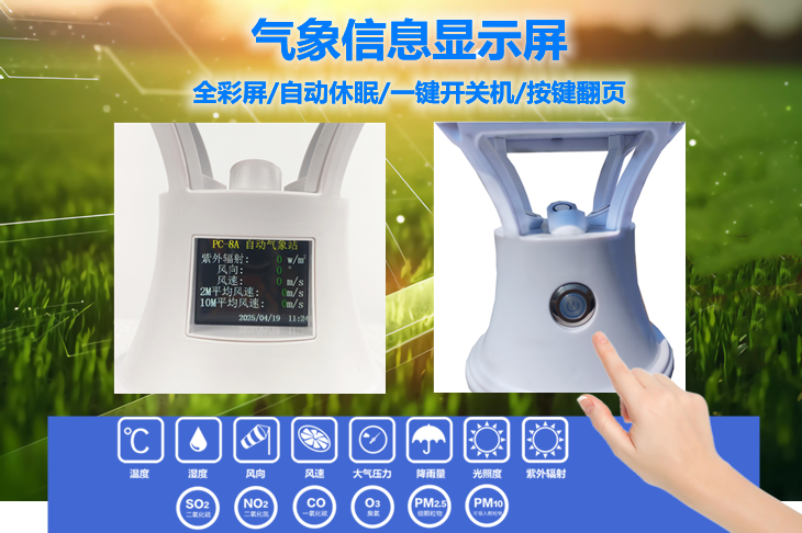 3. 全彩顯示屏和多功能按鍵:氣象站搭配了全彩顯示屏,彌補(bǔ)了常規(guī)氣象站無法就地顯示的缺陷,多功能按鍵可以實(shí)現(xiàn)一鍵開關(guān)機(jī)、數(shù)據(jù)自動翻頁和背光顯示等功能。