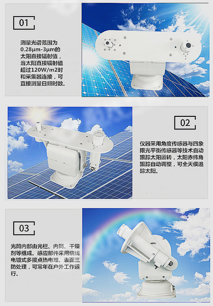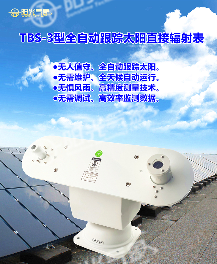 TBS-3全自動跟蹤太陽直接輻射表是國內的無人值守太陽直接輻射表。它人性化的設計理念,使人們對太陽直接輻射的測量不再繁瑣。無需每天的調試,無需不停的維護,你只需要將它安裝在測試場地,就可以精確的測量到每天不同時刻的太陽直接輻射值。