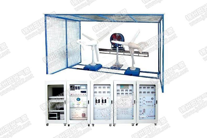 本系統由模擬風系統、模擬風控制系統、離網逆變系統、充電控制系統、負載系統和風能控制系統組成;其中有2個被控對象和5個控制柜組成。模擬風力發電系統用4000w的鼓風機模擬自然風,其風力大小可以通過變頻器控制鼓風機轉速來完成,PLC采用PWM模式對直流減速電機進行調速控制;鼓風機在交流電動機的驅動下左右移動,左右旋轉以改變風吹方向,以模擬不同風速風向下的發電效果風力風向檢測裝置檢測風力大小及方向;發電風車實時跟蹤發電。發電風車還配有葉片轉速檢測裝置,在計算機上實時顯示其運轉狀況及相應參數。