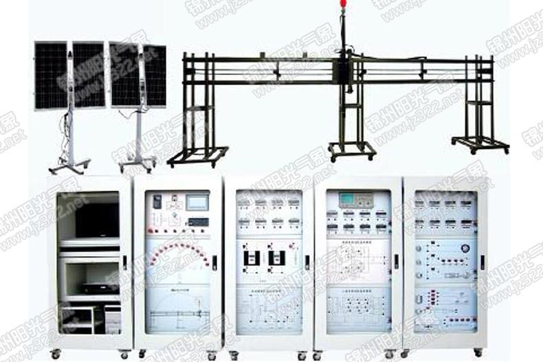 YG-JXST05型大型模擬太陽升降、太陽跟蹤、光伏發(fā)電、充電逆變實訓(xùn)裝置采用1000W節(jié)能燈模擬太陽,實驗裝置可以模擬太陽的弧線升降全過程,而且模擬太陽的升降時間可以根據(jù)實驗需要進行更改。兩臺太陽跟蹤系統(tǒng)對模擬太陽的移動進行跟蹤,兩臺太陽跟蹤系統(tǒng)上的光伏發(fā)電裝置分別在模擬太陽下的進行發(fā)電,并在充電控制系統(tǒng)的控制下向蓄電池充電,逆變系統(tǒng)對蓄電池的直流電進行逆變,產(chǎn)生220V交流電,并給燈泡交流電機等負(fù)載供電。