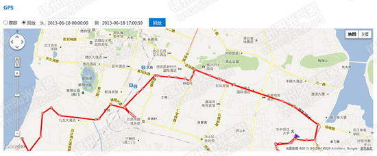 用戶可在平臺上通過在線電子地圖(Google Map、Baidu地圖等)總體瀏覽用戶所有設備的地理位置,查看某位置設備的詳細信息。在電子地圖上也可以通過縮放地圖,更加細致地瀏覽設備。用戶也可在平臺上直接查看GPS類型的傳感器數據,將每個數據點用直線連接,繪制成一條運動路徑。如下圖所示: