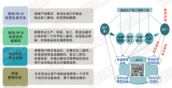 食品追溯平臺是一個基于B/S 架構的軟件平臺,系統將每個環節的食品關聯信息自動記錄到數據庫,用戶可以通過互聯網訪問系統獲取相關的食品追溯信息。食品安全溯源系統主要包括三個子系統、一個數據庫。