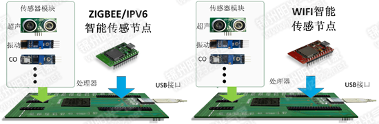 每個節點基于"傳感器+處理器"的架構,可以獨立運行,配合20 多種傳感器模塊,滿足物聯網專業"智能傳感器"相關課程的教學實驗。