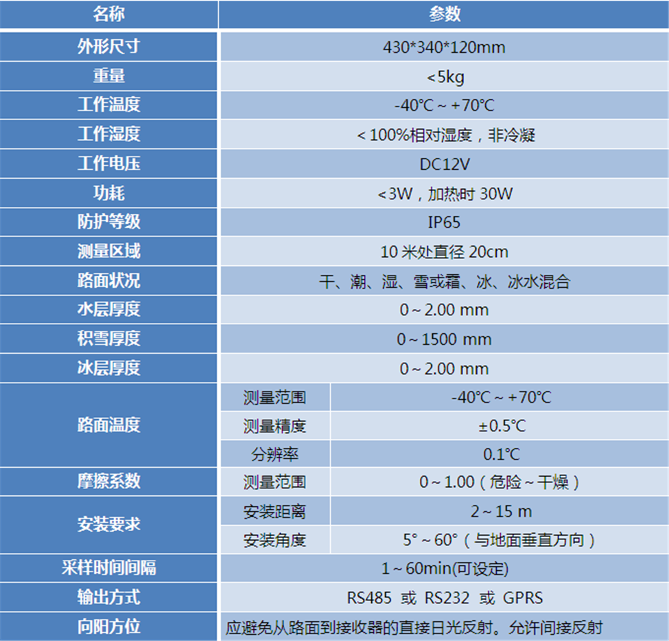 路面溫度采用紅外測(cè)溫原理,實(shí)現(xiàn)了非接觸遠(yuǎn)距離精準(zhǔn)測(cè)量路面溫度。