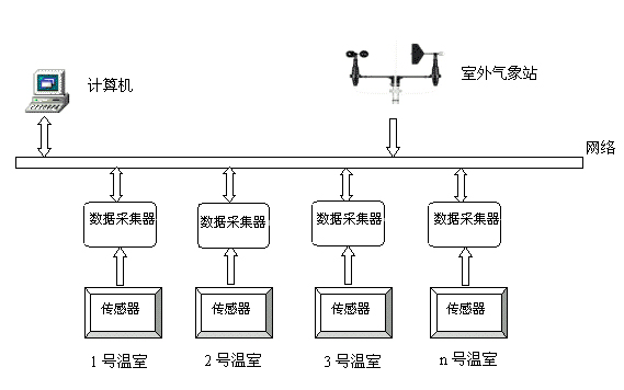 光溫室集群監控系統包括:計算機、打印機、數據采集器、溫室用傳感器(溫度、濕度、光照等)、監控軟件。