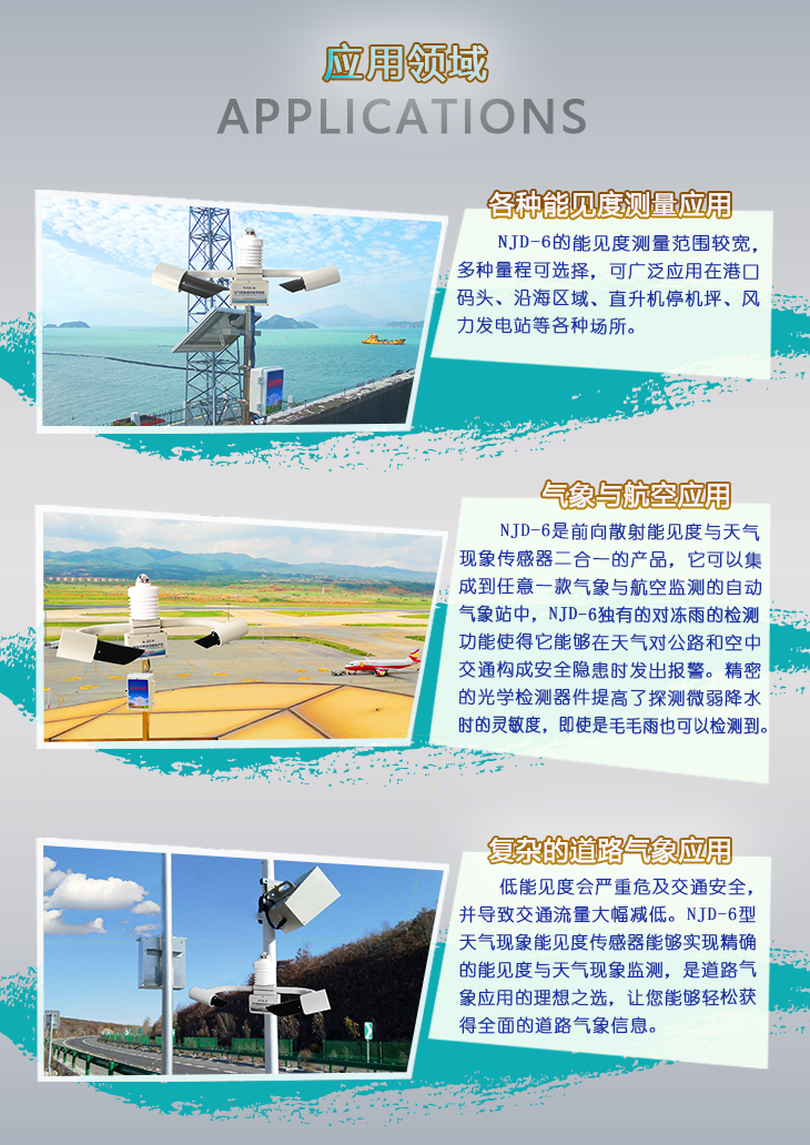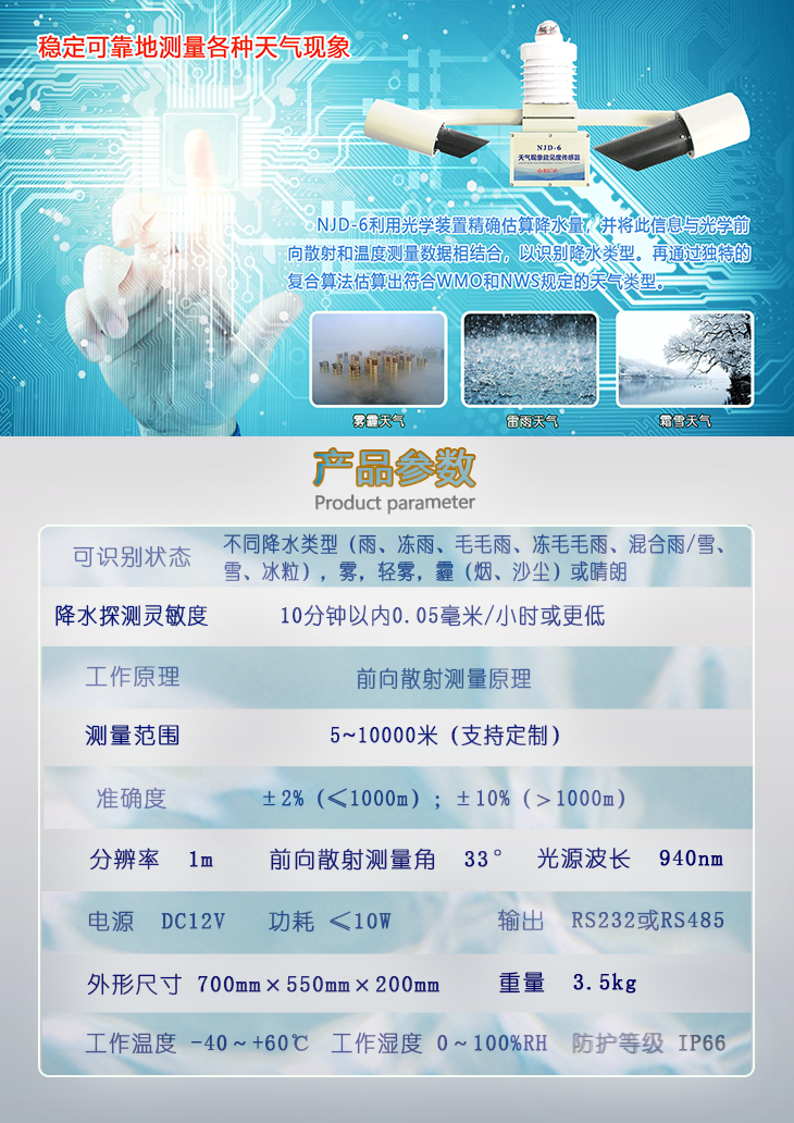 NJD-6型天氣現象能見度傳感器是錦州陽光自主研發的國產化高精度天氣現象探測設備,可以識別各種雨及雪的狀態,超越了傳統的雨量儀器,滿足對雨雪的精密觀測,同時又可以實時監測能見度的數據。